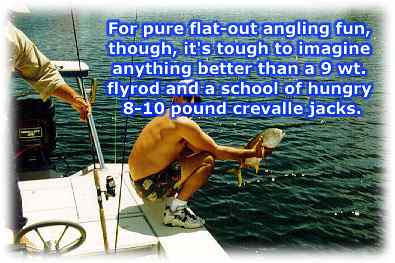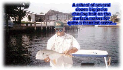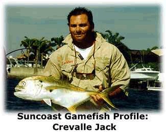Pound for pound inch for inch tooth for tooth the toughest, fightin'est, downright meanest Suncoast inshore gamefish is the crevalle jack, or as he is more simply known jack. This ball of fire brings the total package - vicious strikes, searing, drag-scorching runs and a head-shaking, doggedly determined fighting style that continues even after he's in the boat (watch those fingers)!. Jacks are pretty easy to find - they roam in packs, hunting baitfish of all type. They herd their quarry into a given area, then launch the attack, snapping their formidable teeth at anything that moves. The panicked baitfish often head for the surface, closely followed by the jacks - creating a mass of frothing water that's a dead giveaway to their presence. Jacks will often corner their intended meal against a seawall or other structure, cutting off the baitfishs' escape route. A school of several dozen big jacks chasing bait on the surface makes for quite a frenzied scene - and an almost-guaranteed hook-up for the angler close enough to lob a bait into the melee. Jacks are around the Suncoast waters all year - in fact, they're a reliable standby during the dead of winter spells that we occasionally have. Many a frustrated February flyrodder has had his day saved by a few big jacks chomping a streamer fly. If you're drift fishing the flats, drop a chum block in the water and wait - it probably won't be long before the jacks show up, wondering what smells so good and looking for a free meal. We generally categorize jacks as inshore fish, but the fact is they're also found well offshore, generally around wrecks and reefs but also in open water. They usually run in the 2-10 pound range, but they grow to over 50 pounds - a jack in the 25-30 pound range is a double handful on any type of inshore tackle. Most jacks are caught "accidentally" - that is, they are not the targeted species of most anglers. The reason why these fierce battlers are not highly sought after is that they're not very good to eat. The flesh of a jack is very bloody and dark, and the meat simply tastes too strong for most folks' palate. If you know of a good recipe for jacks, we'd love to know it just please don't send the old "throw the fish away and eat the board" joke. Tackle requirements everything from flyrods to heavy offshore tackle has been used to land a jack. Spinning tackle in the 6 - 12 pound range allows the fish to give a good account of itself, and will definitely present you with a challenge if a whopper grabs hold. For pure flat-out angling fun, though, it's tough to imagine anything better than a 9 wt. flyrod and a school of hungry 8-10 pound crevalle jacks. You'll become well-acquainted with a fair portion of your backing and get good insight into the condition of your drag (not to mention your wrist and forearm). You'll also sharpen your playing and landing skills in preparation for the day when it's a 20 pound snook holding onto your Clouser Minnow. Best baits name it. Hungry jacks will take a swipe at just about anything, and can become a nuisance when they start grabbing those sardines you worked so hard to find. If you see a school you want to tangle with, toss a flashy jig or spoon into the midst of the fracas and hold on tight. It's a good idea to use 20-30 pound leader, maybe even wire if you know the jacks are running really big. Flyrodders should attach a 20 pound shock tippet to guard against those fearsome choppers. That's it for the jack. They are tons of fun, and provide reliable action on the days when everything else develops lockjaw. Show them the respect they deserve - practice catch and release, use bronze hooks and cut the line if the fish swallows the bait. |