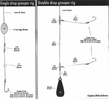 There are two basic rigs that Ng uses all of the time. One is a two-drop rig that is basically just an over-sized bottom rig. He starts by connecting a pair of 2/0 three-way swivels with a piece of 125 pound mono so that they are three feet apart. To one of the three-way swivels he ties a short piece of 80 pound mono and then makes a loop in the other end to attach to a banks style sinker. This allows the sinker to break away, if snagged, without losing the entire rig. To the other eye of this three-way swivel, he attaches a 2-1/2 foot piece of 125 pound mono. This is the bottom of the rig. At the other three-way swivel, he attaches a two foot piece of 125 pound mono. The other eye of this swivel is used to tie the rig to the line from the reel. For grouper, Ng attaches either 8/0 or 9/0 hooks to the short pieces of mono. For snapper he downsizes the hooks to 5/0 or 6/0. His favorite hook is an Eagle Claw series 84 which is offset and bronze.