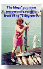 are April 15th until about the end of May, and Thanksgiving through the middle of December. The easiest way to know when the kings should be in your area is to keep an eye on the water temperature in the Gulf. The kings optimum temperature range is from 68 to 72 degrees F. Higher or lower temperatures send the kings north, south or west in search of that magic 68-72 range. Of course, the best places to fish are wherever the bait is most plentiful. Usually this is near hard bottom, in the passes, or even right up next to the beach. Suncoast pier fishermen catch their share of kings within a stones throw of shore.
